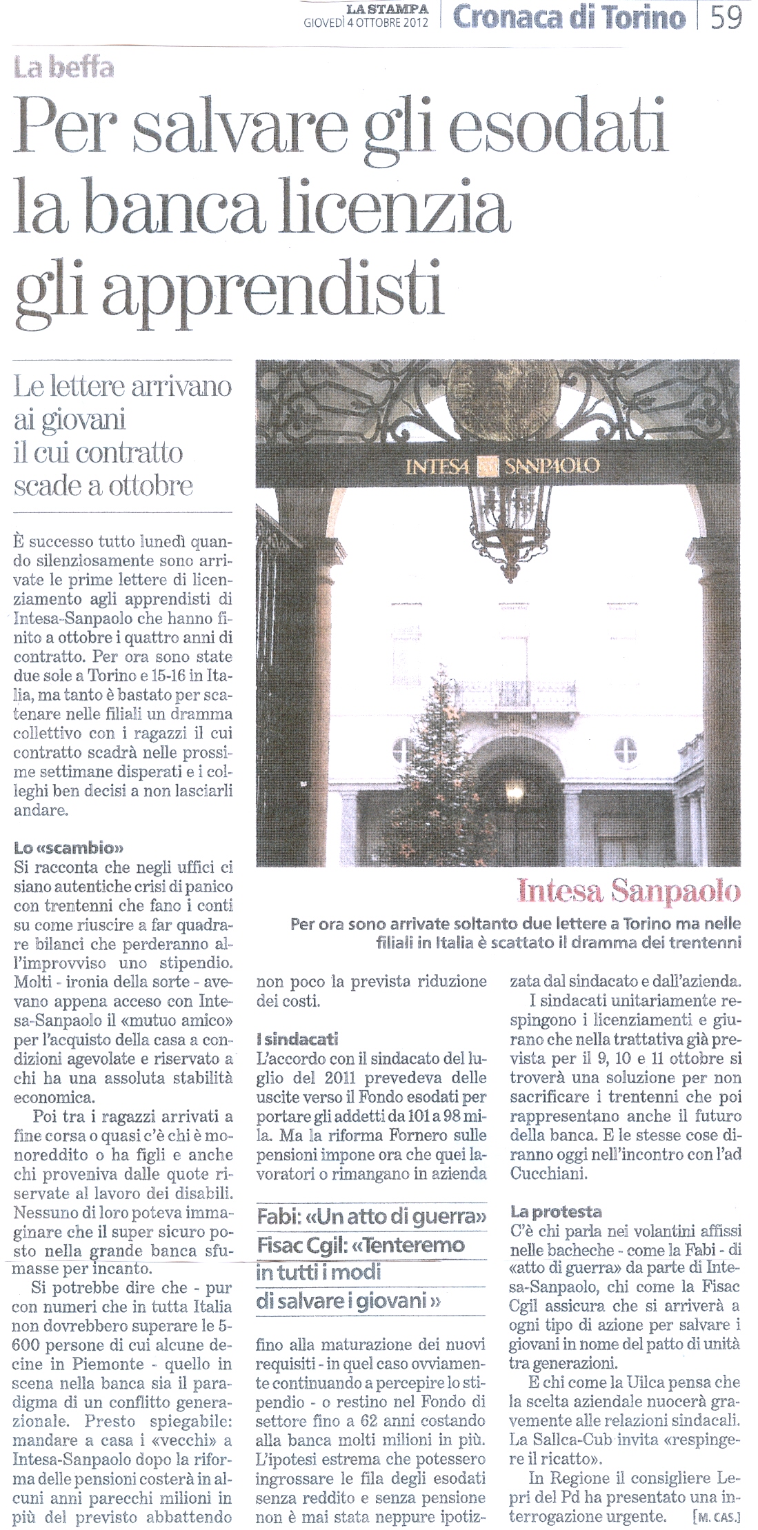 Abbiamo depositato ieri una interrogazione urgente rispetto alla notizia del licenziamento di 15 apprendisti, dipendenti a tempo indeterminato di Intesa San Paolo, con contratto in scadenza a ottobre.